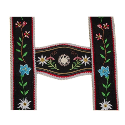 Classic Bavarian leather trousers with attached adjustable suspenders, combining traditional style with secure, comfortable fit.