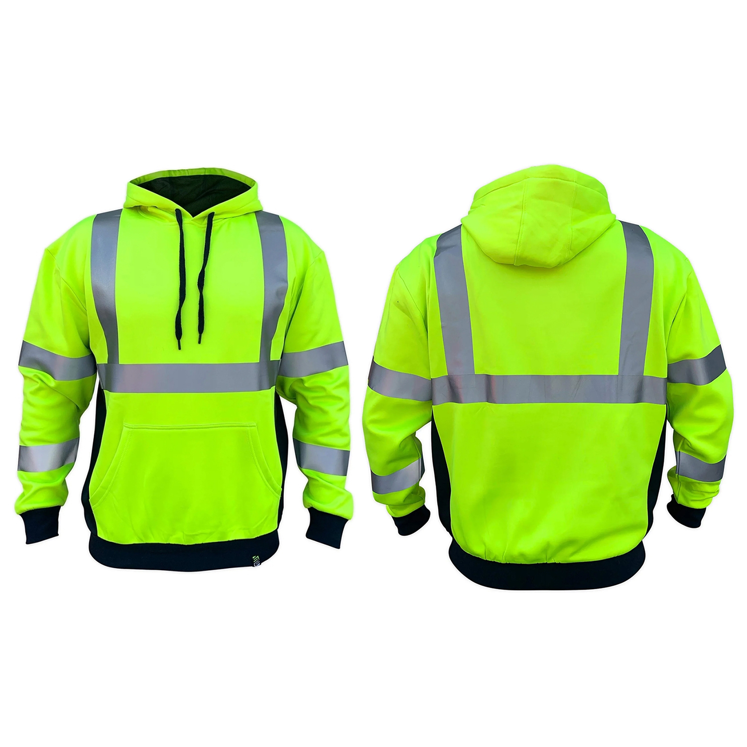 It has two lower pockets and an adjustable drawstring work wear hood.